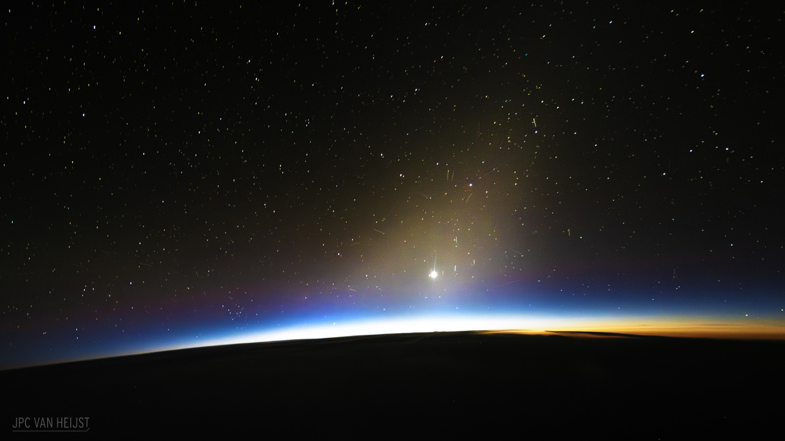 To complement the vision of our celestial neighbourhood, planet Venus shines brightly ahead, reflecting solar rays from her cloudy atmosphere, over a thirty millions of miles away.