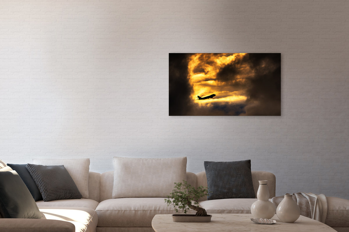 The typical silhouette of a Boeing 747 climbing out in stormy autumn skies.